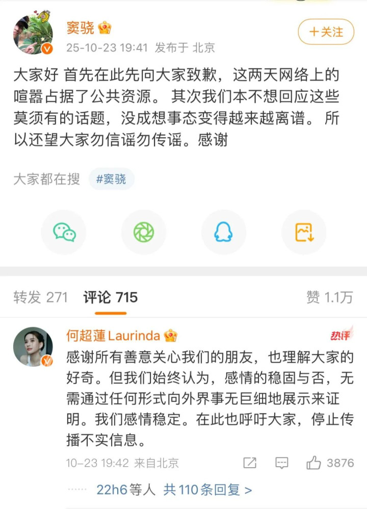 10月23日晚19:41,近日因向太发布的视频引发婚变传闻的窦骁、何超莲夫妇发布声明。